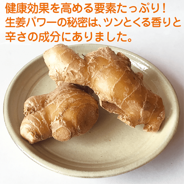 生姜は、私たちの日常の中でに古くから慣れ親しまれていた食材。「食べる万能薬」といわれる生姜の成分は、ほとんどが水分ですが、生姜の成分を分析すると、辛み成分が約250種類、香りの成分は約50種類も含まれており、そのなかでも特に効果を認められている辛み成分が3種類あるといわれています。